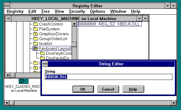 - On the right-hand side, there should be one REG_SZ value, containing something like KBDUS.DLL or KBDUK.DLL. Change this to the name of the DLL you just installed (US122.DLL or UK122.DLL).